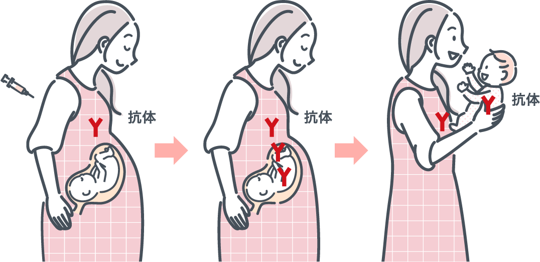 妊婦さん(お母さん)に接種することによって、お母さんの体の中でRSウイルスに対する抗体を増やし、胎盤を通じてお母さんから赤ちゃんへ抗体が移行することで、赤ちゃんにおけるRSウイルス感染を予防するためのワクチンです(産まれてすぐの赤ちゃんにワクチンを接種しても抗体ができにくいため、お母さんが作った抗体を赤ちゃんにプレゼントするイメージです)。